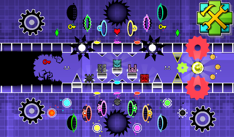 Controls are intentionally simple: a single tap (or click) is the primary input. That tap typically makes your icon jump or interact with an in-level mechanic. Some sections require you to hold the button for a longer jump or to control alternate vehicle types like ships or balls, which respond differently to taps and holds. Other controls are effectively handled by level design: portals that flip gravity, change size, or teleport you into a new mode are triggered by passing through them rather than by extra buttons.