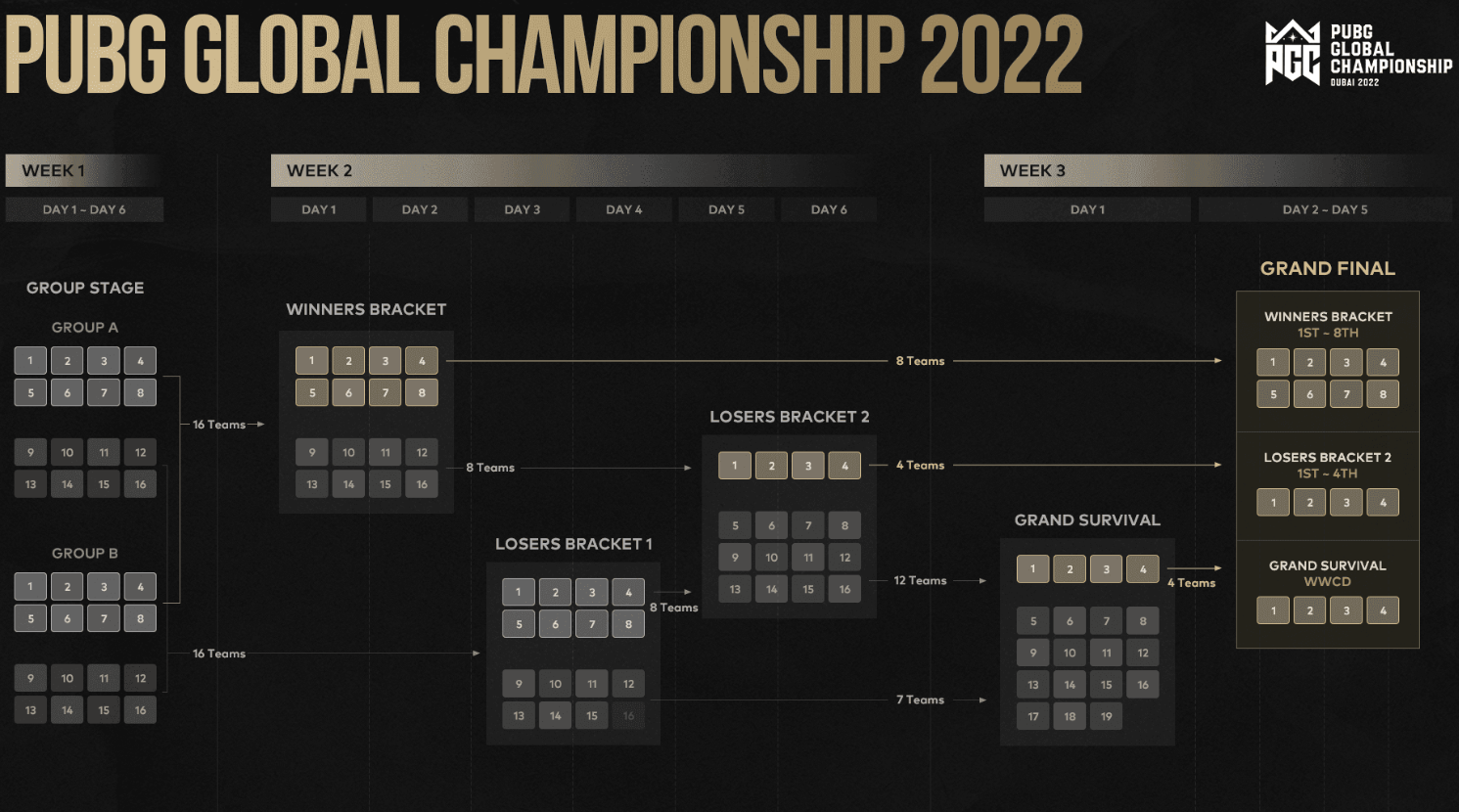 - The PMGC Grand Finals typically take place over several days, featuring an intense multi-match format. Each team must alternate between playing on all maps, and the total points determined the final ranking. The team with the highest points is crowned the PMGC world champion.